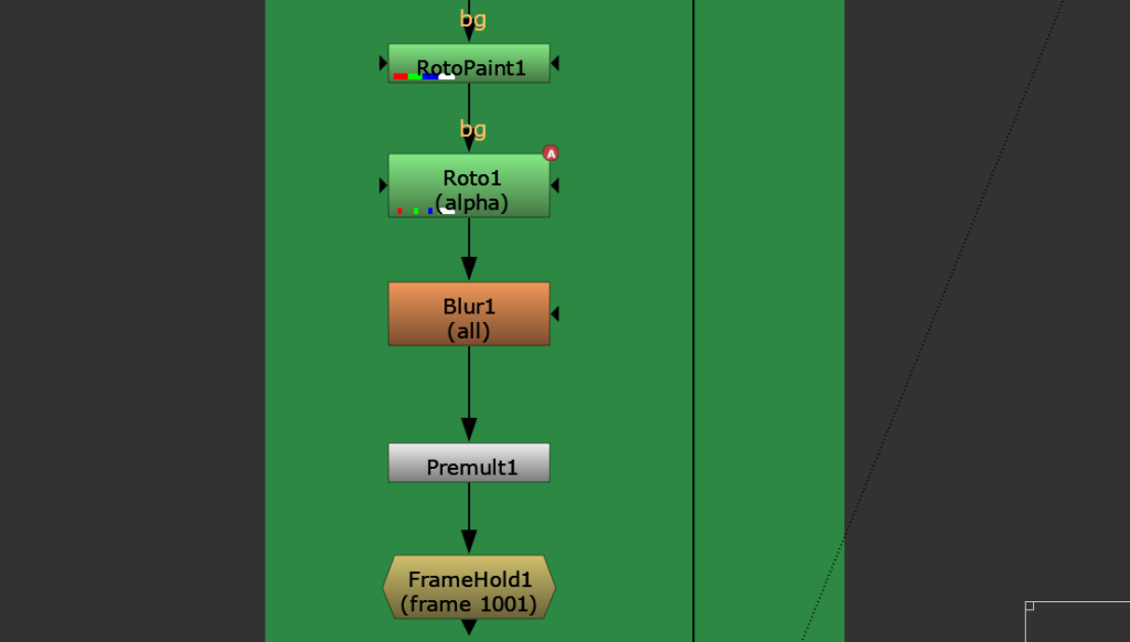 This Part is for remove light by the roto paint node. Because I don’t export Alpha channel in the RotoPaint1 so I recreate The Roto1 node to draw a alpha shape covering the old one. Then I blur the edge a little and premult RGB with alpha. Finally hold the Frame to keep the image same.