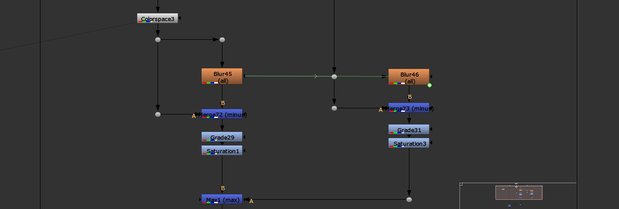 Once I merge the raw sequence and the patch, I almost get good result. However, the tiny grains is not correct. To see the problem obviously, I need extract the tiny noise. The input sequence is divided into two ways to extract noise and enhanced them. Secondly, select higher value color, which shoule be the noise, to merge. In this process, adding grades and colorcorrect node is helpful for enhance the noise. Then puls the extracted noise to the raw sequence and I can get a specific result to check the tiny grain.