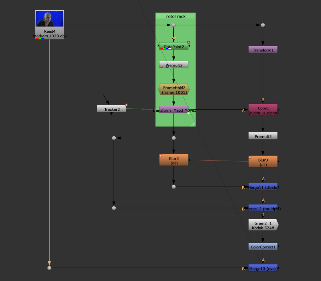 This sequence is not easy to track even I tried my best to adjust the colour to extract more contrast. Such as the picture below, the left line I want to divide the picture into two parts and one of the parts will keep colour, another one keep other information. Then I use rotopaint node to cover the marker shape and copy the marker transform position to the rotopaint node. However, the result is not perfect, because the specific marker in cheekbones has obviously changed of shadow and shape deformation. I combine another method to solve certain frames and mix them in end.