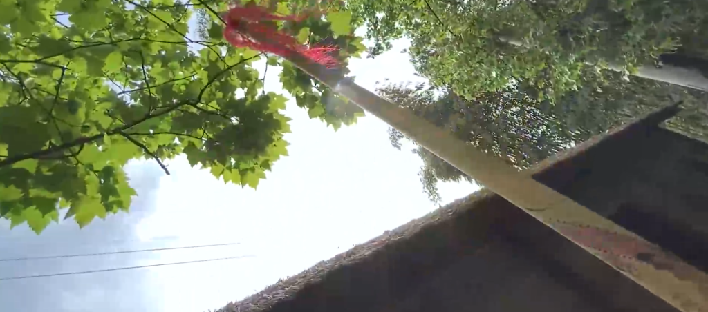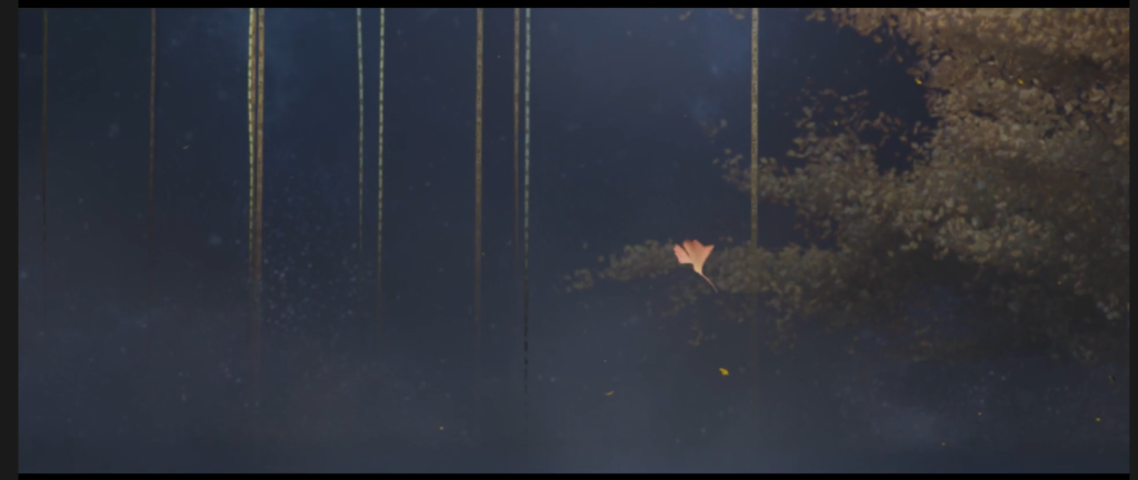 Empty shots illustrate the scene, and the shots drift with the leaves and land on the spear.