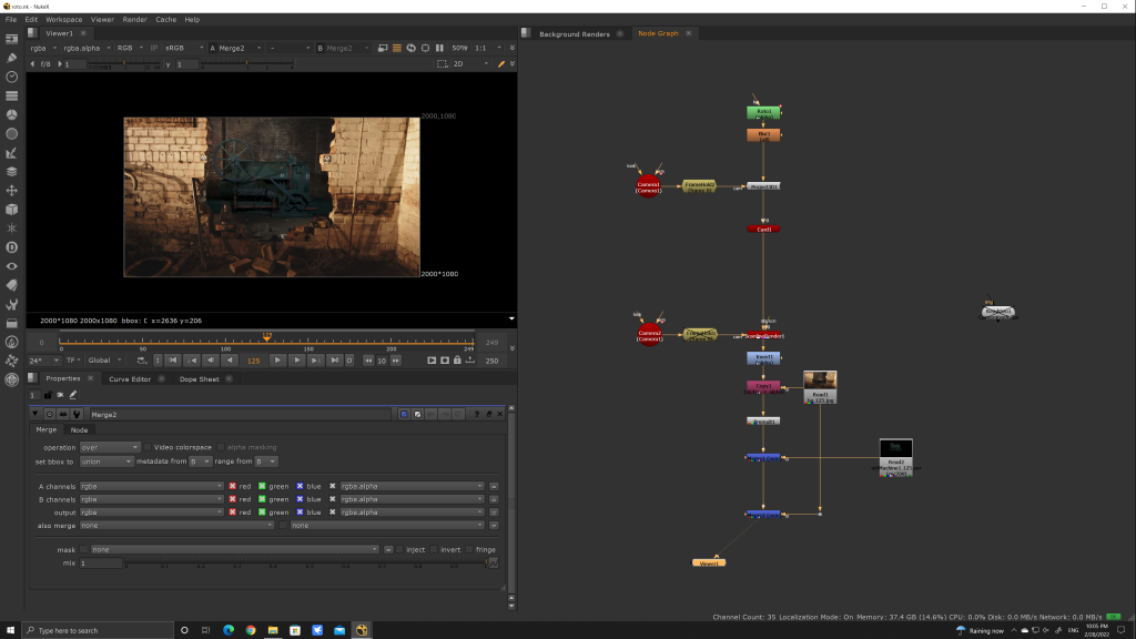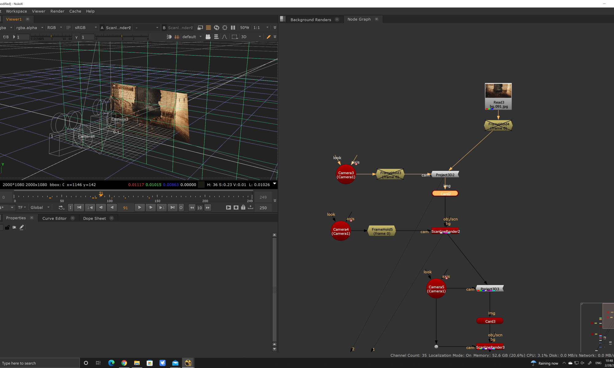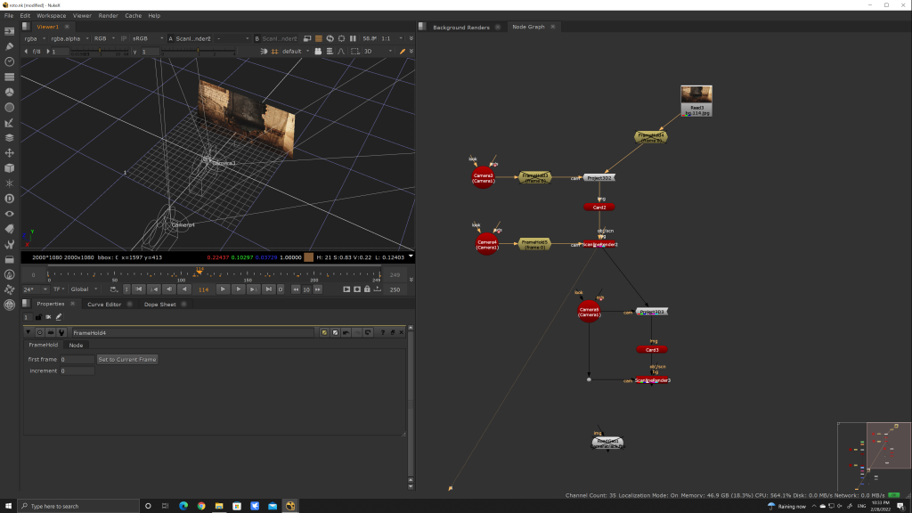This week we have learned more examples about the project node. In certain statistic building scene it is a really fast way to patch or add something in images by the project node. We mainly learned two interesting ideas to come true some amazing results. Firstly, we can use the project camera to map certain frame information to realistic space coordinates in the nuke 3D view. Then we can operate what we want in the single frame and use the tracking camera to render the whole images again. Finally the patch elements will be automatically catch to the moving. However, a issue we have to focus on. Almost all ideas can skip the frame hold node which means we the patch area is just a single frame and we only use one single information to cover the whole sequence.